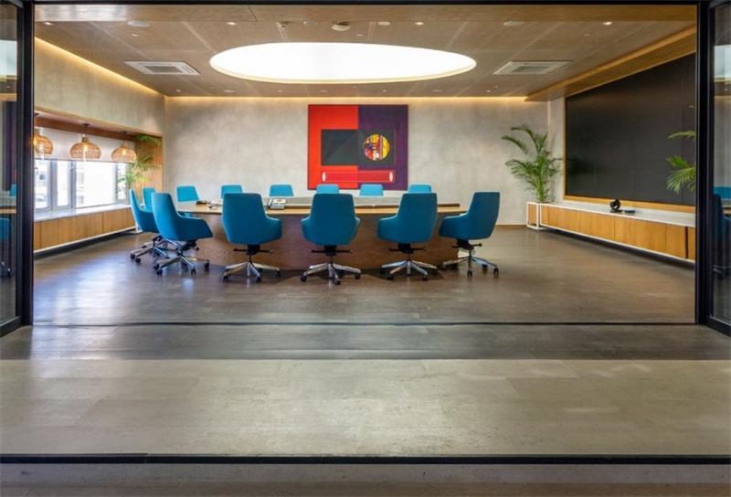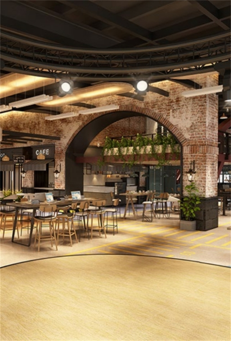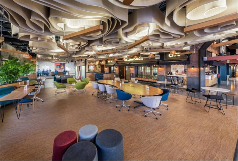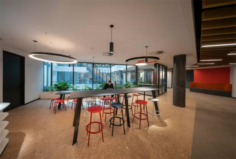 不規則的曲線吊頂、撞色的桌椅、復古的磚石還有明艷的綠植,如此復雜的設計氛圍,軟木地板卻能巧妙的融入其中,給整個空間增添了沉穩恬靜的質感。無論在此辦公還是休憩,柔軟舒適的腳感帶給你輕松安寧的心境。